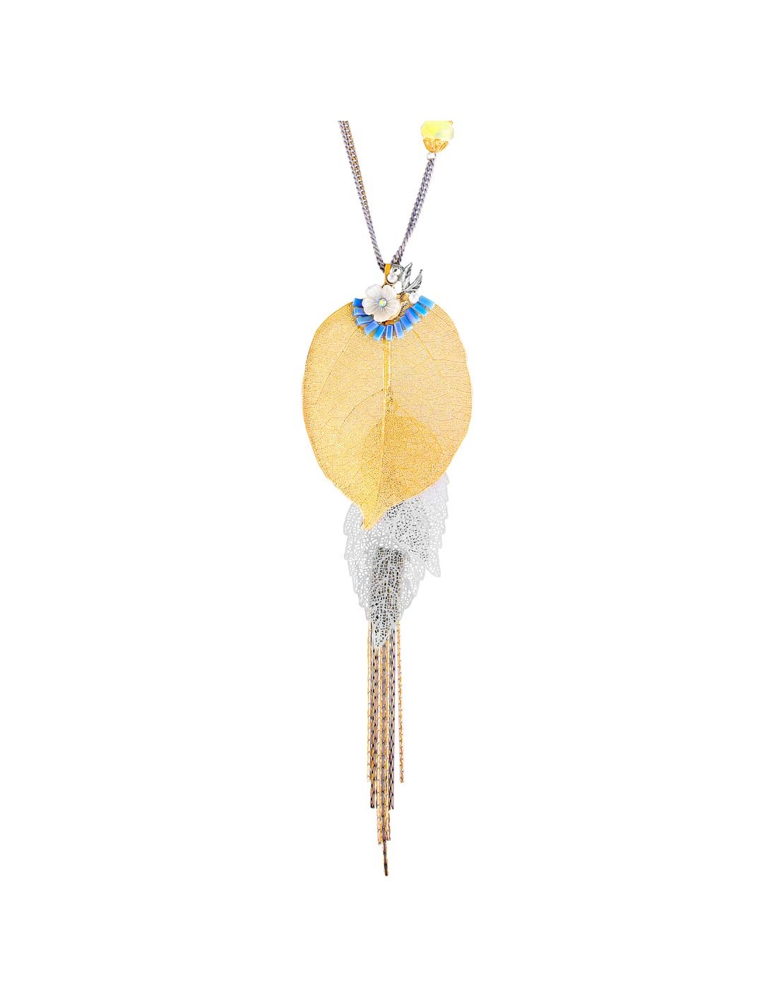 Collier ROMANTICA Color Gold & Silver Sautoir pendentif en Y Feuille Argent Doré Multicolore Rhodium Cristal et Nacre Naturelle