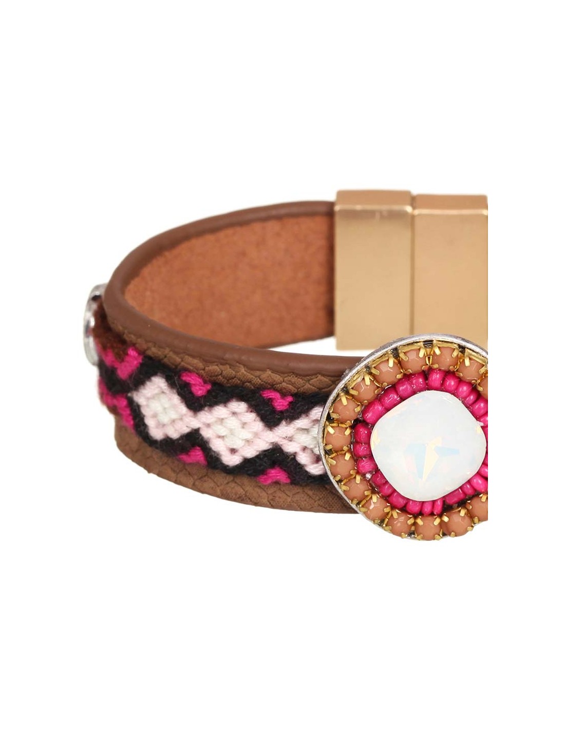 Bracelet BOLIVAR Pink Gold Manchette souple Ethnique Rose Laiton doré à l'or fin et Cuir Cristal et Tissage brésilien et perles